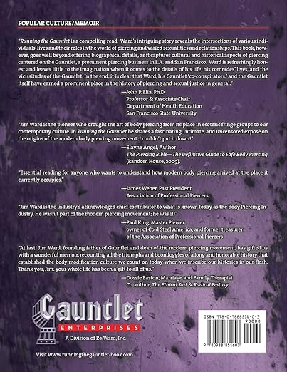 Num documentário de 2003 intitulado a "História Social do Piercing", a MTV chamou Jim Ward de “o avô do movimento moderno de piercing”. Jim abriu o Gauntlet, o primeiro estúdio de piercing corporal do mundo, em meados da década de 1970, estabelecendo as bases para o que se tornaria uma indústria mundial. Jim foi responsável não apenas por popularizar os vários piercings corporais, mas também por desenvolver muitas das técnicas de piercing e designs de joias que são de uso comum hoje. Running the Gauntlet fornece uma história íntima do homem e do seu legado.